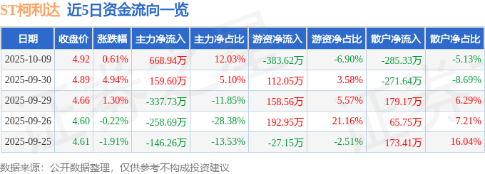 证券之星消息,截至2025年10月9日收盘,ST柯利达(603828)报收于4.92元,上涨0.61%,换手率1.86%,成交量11.11万手,成交额5562.27万元。