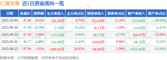 证券之星消息,截至2025年10月9日收盘,仁度生物(688193)报收于47.48元,上涨0.61%,换手率1.39%,成交量5554.0手,成交额2643.63万元。