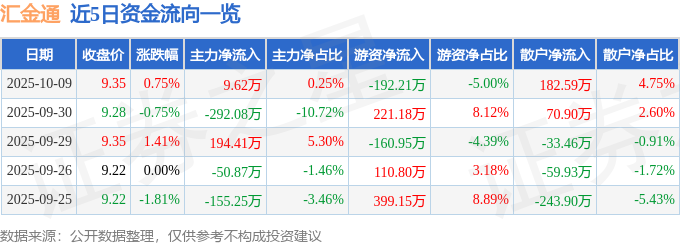 证券之星消息,截至2025年10月9日收盘,汇金通(603577)报收于9.35元,上涨0.75%,换手率1.21%,成交量4.11万手,成交额3845.96万元。