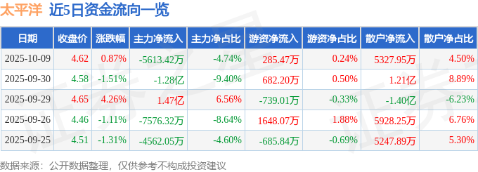 证券之星消息,截至2025年10月9日收盘,太平洋(601099)报收于4.62元,上涨0.87%,换手率3.77%,成交量257.11万手,成交额11.83亿元。