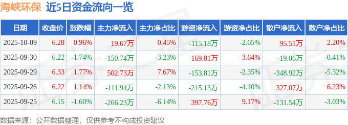 证券之星消息,截至2025年10月9日收盘,海峡环保(603817)报收于6.28元,上涨0.96%,换手率1.22%,成交量6.95万手,成交额4348.15万元。