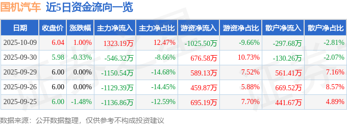 证券之星消息,截至2025年10月9日收盘,国机汽车(600335)报收于6.04元,上涨1.0%,换手率1.18%,成交量17.71万手,成交额1.06亿元。
