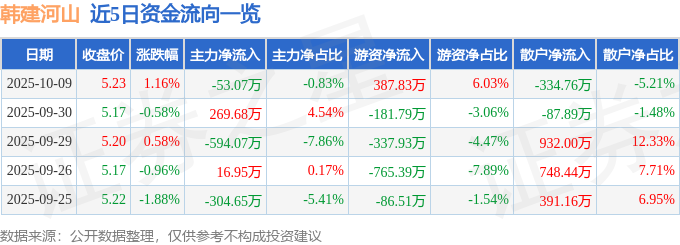证券之星消息,截至2025年10月9日收盘,韩建河山(603616)报收于5.23元,上涨1.16%,换手率3.21%,成交量12.32万手,成交额6427.26万元。