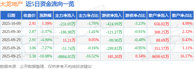 证券之星消息,截至2025年10月9日收盘,大龙地产(600159)报收于2.91元,上涨1.39%,换手率5.47%,成交量45.36万手,成交额1.32亿元。
