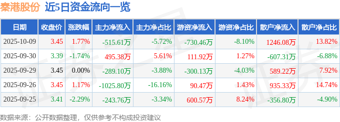 证券之星消息,截至2025年10月9日收盘,秦港股份(601326)报收于3.45元,上涨1.77%,换手率0.55%,成交量26.27万手,成交额9018.52万元。