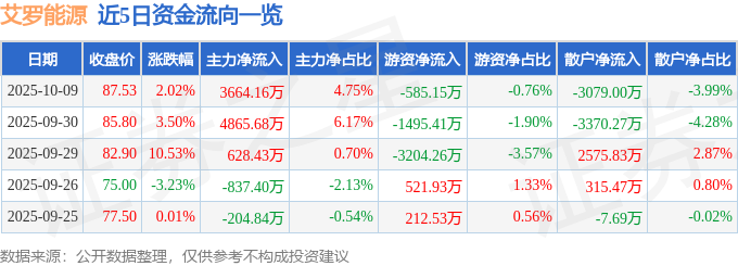 证券之星消息,截至2025年10月9日收盘,艾罗能源(688717)报收于87.53元,上涨2.02%,换手率8.98%,成交量8.72万手,成交额7.71亿元。