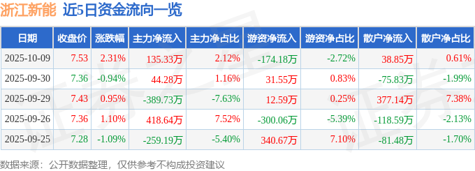 证券之星消息,截至2025年10月9日收盘,浙江新能(600032)报收于7.53元,上涨2.31%,换手率0.36%,成交量8.56万手,成交额6397.64万元。