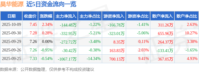 证券之星消息,截至2025年10月9日收盘,昊华能源(601101)报收于7.45元,上涨2.34%,换手率1.11%,成交量16.05万手,成交额1.18亿元。