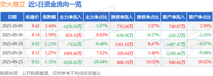 证券之星消息,截至2025年10月9日收盘,交大昂立(600530)报收于8.42元,上涨3.44%,换手率3.75%,成交量29.04万手,成交额2.48亿元。