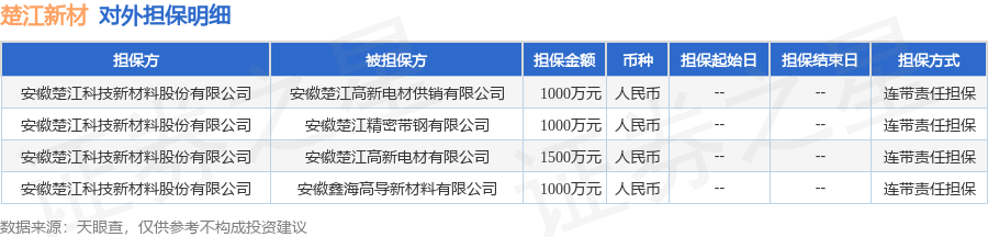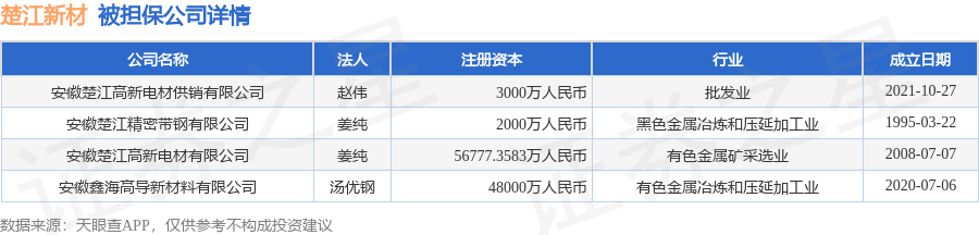 楚江新材10月8日披露4笔对外担保,被担保公司4家。对外担保明细如下表: