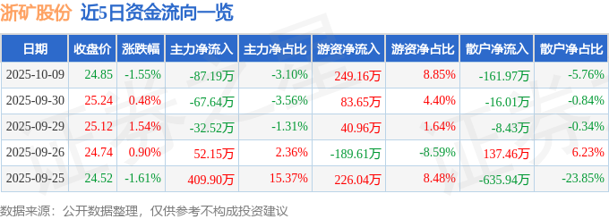 证券之星消息,截至2025年10月9日收盘,浙矿股份(300837)报收于24.85元,下跌1.55%,换手率1.58%,成交量1.12万手,成交额2814.42万元。