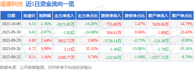 证券之星消息,截至2025年10月9日收盘,遥望科技(002291)报收于6.53元,下跌1.36%,换手率9.14%,成交量79.39万手,成交额5.15亿元。