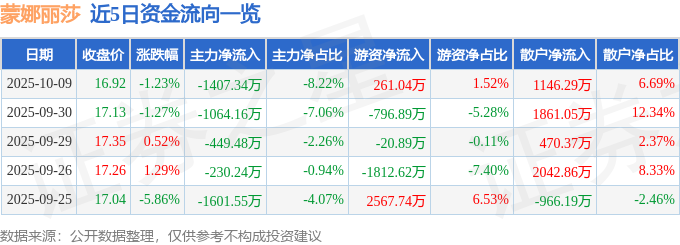 证券之星消息,截至2025年10月9日收盘,蒙娜丽莎(002918)报收于16.92元,下跌1.23%,换手率4.68%,成交量9.98万手,成交额1.71亿元。