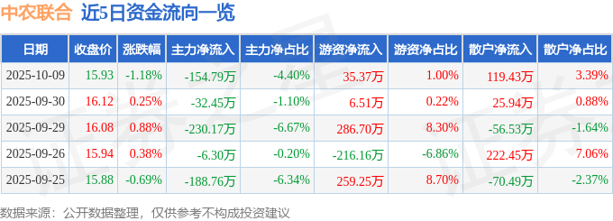 证券之星消息,截至2025年10月9日收盘,中农联合(003042)报收于15.93元,下跌1.18%,换手率1.73%,成交量2.2万手,成交额3519.41万元。