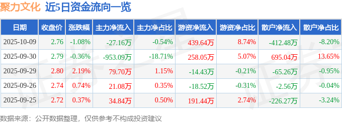证券之星消息,截至2025年10月9日收盘,聚力文化(002247)报收于2.76元,下跌1.08%,换手率2.82%,成交量18.15万手,成交额5032.63万元。