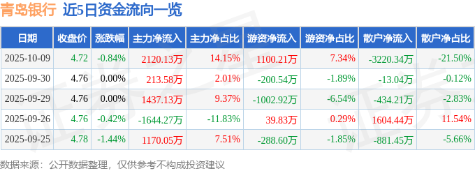 证券之星消息,截至2025年10月9日收盘,青岛银行(002948)报收于4.72元,下跌0.84%,换手率1.02%,成交量31.73万手,成交额1.5亿元。