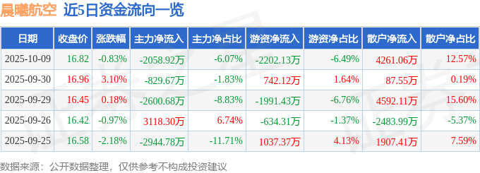 证券之星消息,截至2025年10月9日收盘,晨曦航空(300581)报收于16.82元,下跌0.83%,换手率3.67%,成交量20.2万手,成交额3.39亿元。