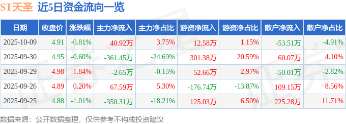 证券之星消息,截至2025年10月9日收盘,ST天圣(002872)报收于4.91元,下跌0.81%,换手率1.03%,成交量2.22万手,成交额1089.89万元。