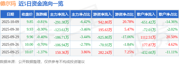 证券之星消息,截至2025年10月9日收盘,德尔玛(301332)报收于9.85元,下跌0.81%,换手率1.74%,成交量4.6万手,成交额4536.92万元。