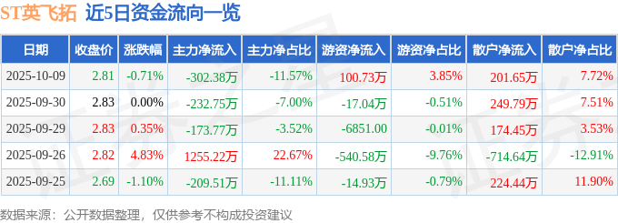 证券之星消息,截至2025年10月9日收盘,ST英飞拓(002528)报收于2.81元,下跌0.71%,换手率0.88%,成交量9.28万手,成交额2612.99万元。