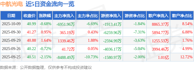 证券之星消息,截至2025年10月9日收盘,中航光电(002179)报收于40.99元,下跌0.68%,换手率1.22%,成交量25.46万手,成交额10.39亿元。