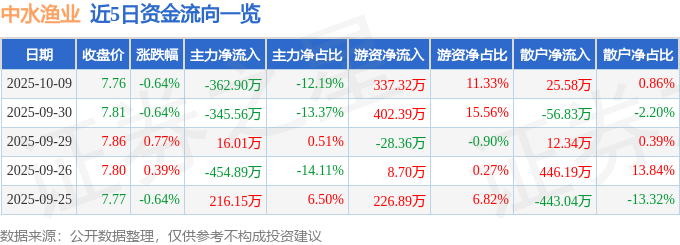 证券之星消息,截至2025年10月9日收盘,中水渔业(000798)报收于7.76元,下跌0.64%,换手率1.05%,成交量3.85万手,成交额2977.1万元。