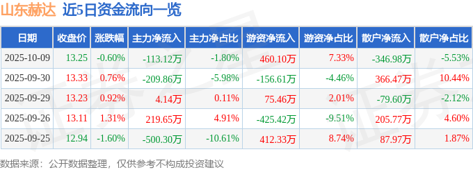 证券之星消息,截至2025年10月9日收盘,山东赫达(002810)报收于13.25元,下跌0.6%,换手率1.49%,成交量4.78万手,成交额6274.34万元。