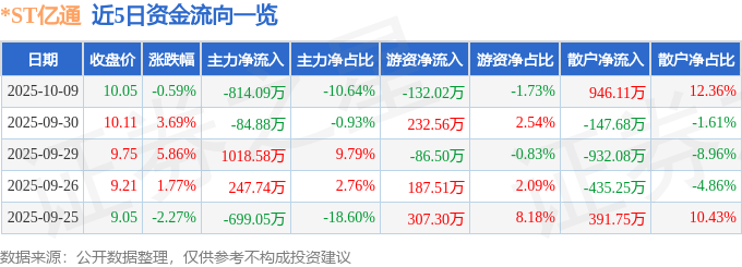 证券之星消息,截至2025年10月9日收盘,*ST亿通(300211)报收于10.05元,下跌0.59%,换手率2.53%,成交量7.52万手,成交额7652.47万元。