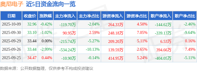 证券之星消息,截至2025年10月9日收盘,奥尼电子(301189)报收于32.96元,下跌0.42%,换手率1.56%,成交量1.75万手,成交额5877.68万元。