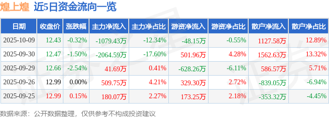 证券之星消息,截至2025年10月9日收盘,煌上煌(002695)报收于12.43元,下跌0.32%,换手率1.38%,成交量7.04万手,成交额8744.37万元。