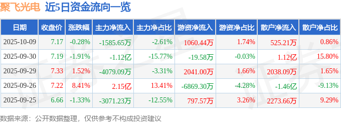 证券之星消息,截至2025年10月9日收盘,聚飞光电(300303)报收于7.17元,下跌0.28%,换手率6.37%,成交量84.63万手,成交额6.08亿元。