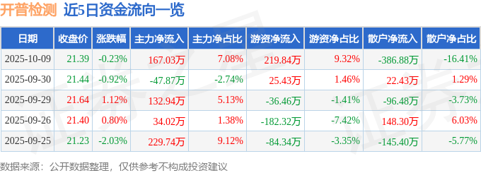 证券之星消息,截至2025年10月9日收盘,开普检测(003008)报收于21.39元,下跌0.23%,换手率1.41%,成交量1.1万手,成交额2357.96万元。