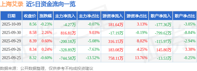 证券之星消息,截至2025年10月9日收盘,上海艾录(301062)报收于8.56元,下跌0.23%,换手率2.18%,成交量6.8万手,成交额5810.7万元。