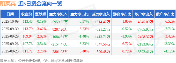 证券之星消息,截至2025年10月9日收盘,凯莱英(002821)报收于113.48元,下跌0.19%,换手率1.99%,成交量6.32万手,成交额7.12亿元。