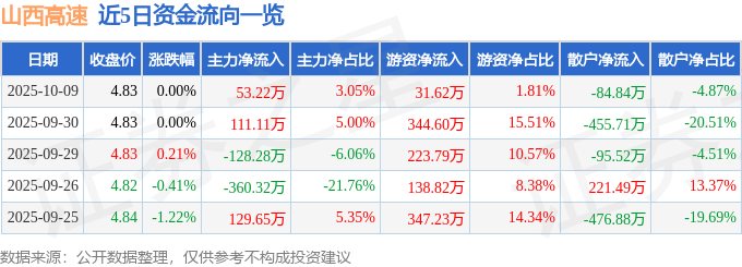 证券之星消息,截至2025年10月9日收盘,山西高速(000755)报收于4.83元,上涨0.0%,换手率0.25%,成交量3.62万手,成交额1742.56万元。