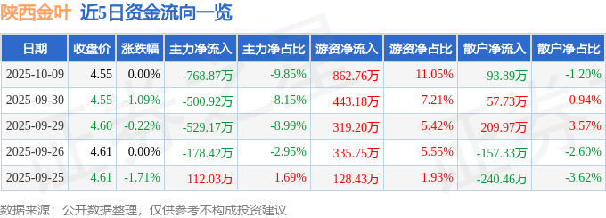证券之星消息,截至2025年10月9日收盘,陕西金叶(000812)报收于4.55元,上涨0.0%,换手率2.25%,成交量17.25万手,成交额7807.99万元。