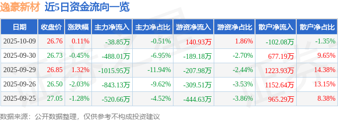 证券之星消息,截至2025年10月9日收盘,逸豪新材(301176)报收于26.76元,上涨0.11%,换手率4.96%,成交量2.8万手,成交额7573.86万元。