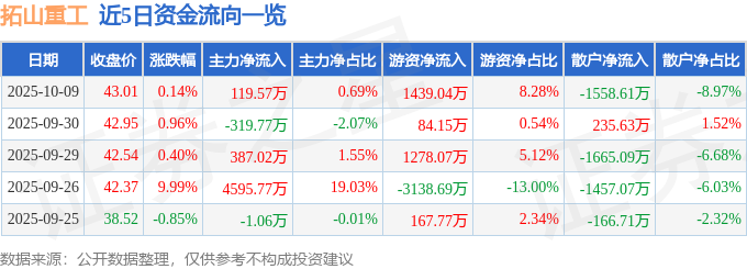 证券之星消息,截至2025年10月9日收盘,拓山重工(001226)报收于43.01元,上涨0.14%,换手率12.21%,成交量4.14万手,成交额1.74亿元。