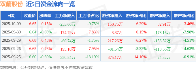 证券之星消息,截至2025年10月9日收盘,双箭股份(002381)报收于6.65元,上涨0.15%,换手率1.12%,成交量3.61万手,成交额2396.06万元。