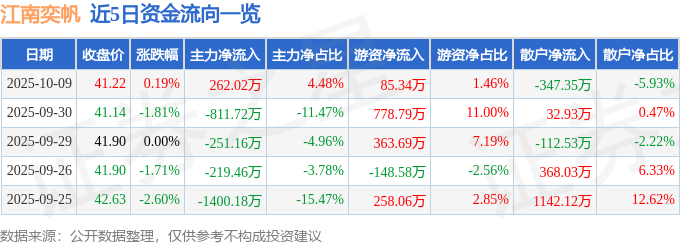 10月9日的资金流向数据方面,主力资金净流入262.02万元,占总成交额4.48%,游资资金净流入85.34万元,占总成交额1.46%,散户资金净流出347.35万元,占总成交额5.93%。