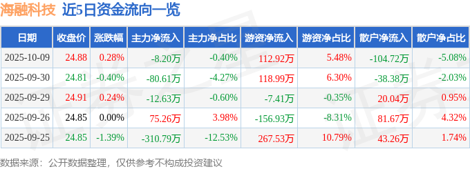 证券之星消息,截至2025年10月9日收盘,海融科技(300915)报收于24.88元,上涨0.28%,换手率1.44%,成交量8319.0手,成交额2061.6万元。