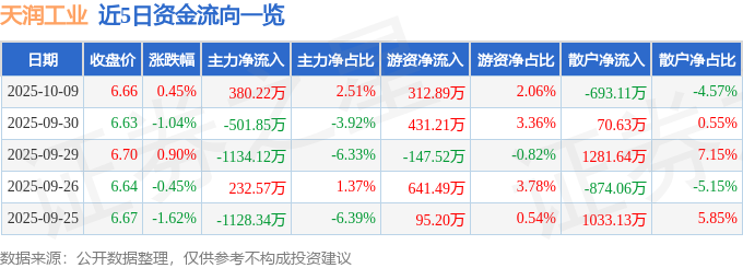 证券之星消息,截至2025年10月9日收盘,天润工业(002283)报收于6.66元,上涨0.45%,换手率2.29%,成交量22.97万手,成交额1.52亿元。