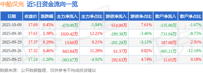证券之星消息,截至2025年10月9日收盘,中船汉光(300847)报收于17.69元,上涨0.45%,换手率1.55%,成交量4.58万手,成交额8068.12万元。