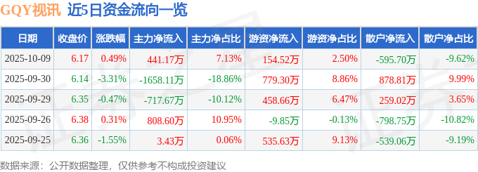 证券之星消息,截至2025年10月9日收盘,GQY视讯(300076)报收于6.17元,上涨0.49%,换手率2.37%,成交量10.04万手,成交额6190.26万元。