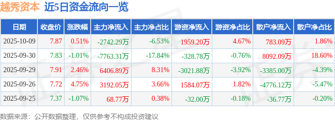 证券之星消息,截至2025年10月9日收盘,越秀资本(000987)报收于7.87元,上涨0.51%,换手率1.07%,成交量53.79万手,成交额4.2亿元。