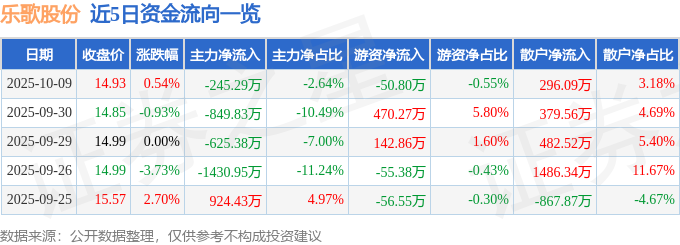 证券之星消息,截至2025年10月9日收盘,乐歌股份(300729)报收于14.93元,上涨0.54%,换手率1.96%,成交量6.29万手,成交额9305.58万元。
