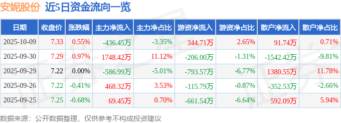证券之星消息,截至2025年10月9日收盘,安妮股份(002235)报收于7.33元,上涨0.55%,换手率3.21%,成交量17.79万手,成交额1.3亿元。