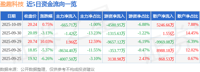 10月9日的资金流向数据方面,主力资金净流出665.71万元,占总成交额1.0%,游资资金净流出4580.95万元,占总成交额6.88%,散户资金净流入5246.66万元,占总成交额7.88%。