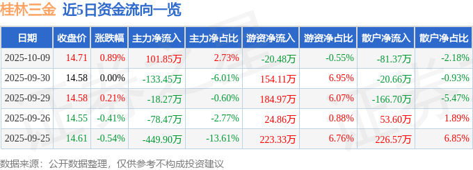 10月9日的资金流向数据方面,主力资金净流入101.85万元,占总成交额2.73%,游资资金净流出20.48万元,占总成交额0.55%,散户资金净流出81.37万元,占总成交额2.18%。
