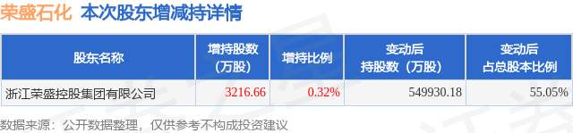 证券之星消息,10月9日荣盛石化发布公告《荣盛石化:关于控股股东增持公司股份计划实施结果的公告》,其股东浙江荣盛控股集团有限公司于2025年7月19日至2025年9月30日间合计增持3216.66万股,占公司目前总股本的0.322%,变动期间该股股价上涨9.91%,截止9月30日收盘报9.65元。